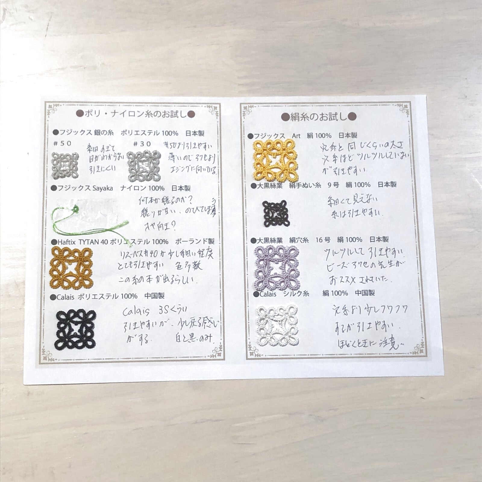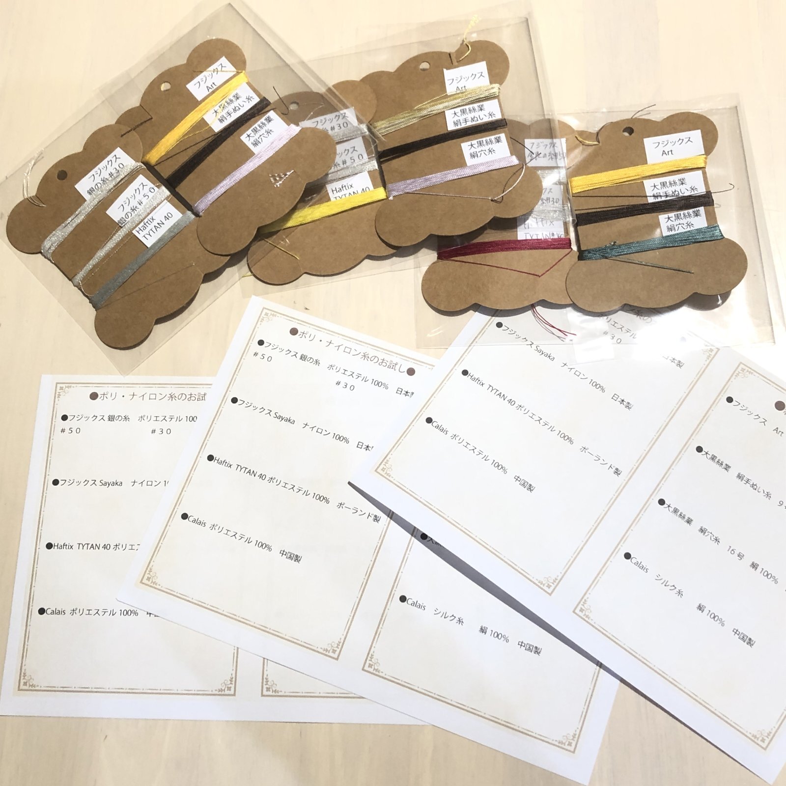 日本、中国、ポーランドから、試してくださいとアクセサリー用のポリエステル、ナイロン系の糸見本をいただいており、ぜひお試ししていただきたく、暇に任せて糸見本カードと、糸を何種類か巻きました(^^♪ 11組限定