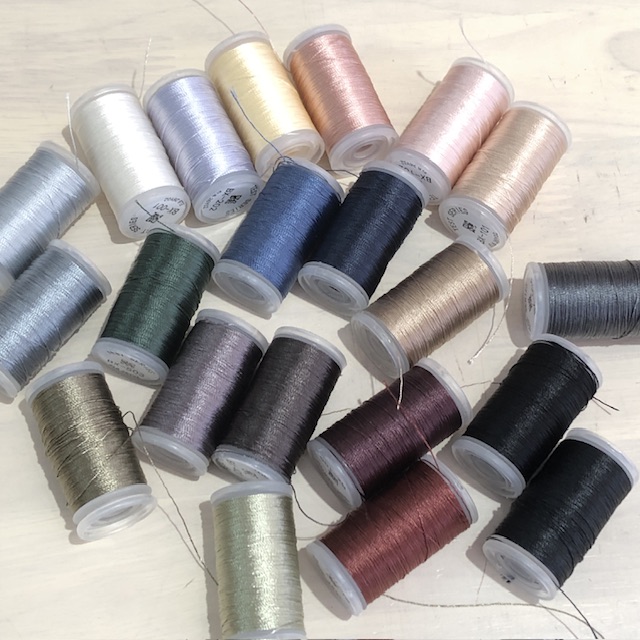 作り始めなければ時間が余りますので、オリムパスさんのラメ糸、Calaisのラメ糸、銀の糸、シルク糸などサンプル糸のお試しも無料でできます。