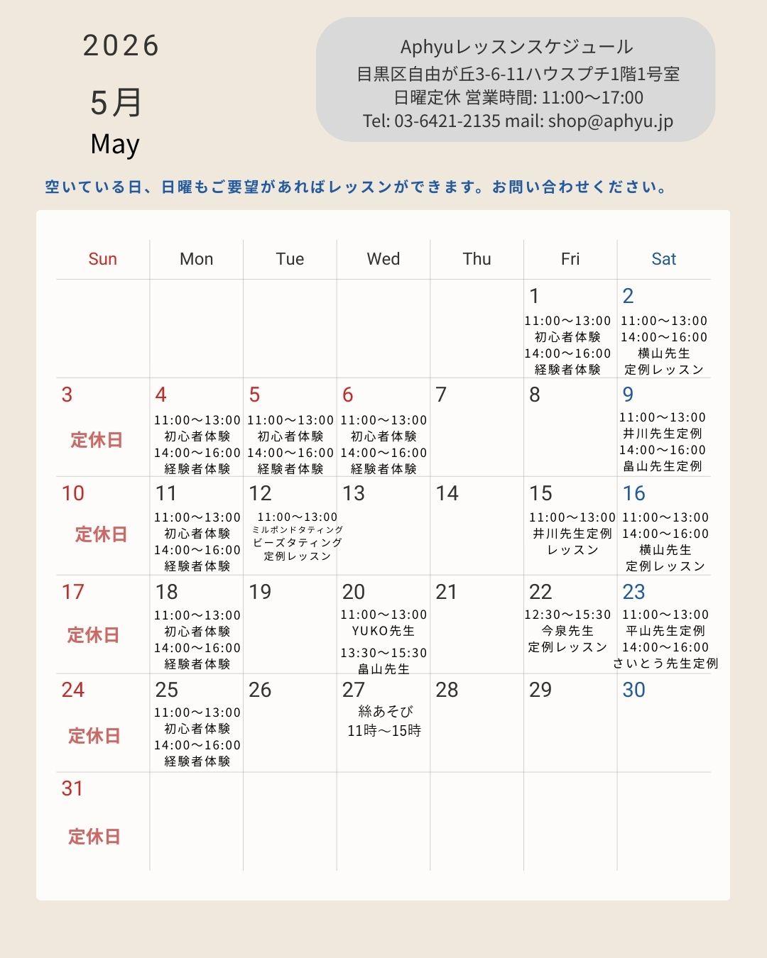レッスンスケジュール 2026年4月〜5月