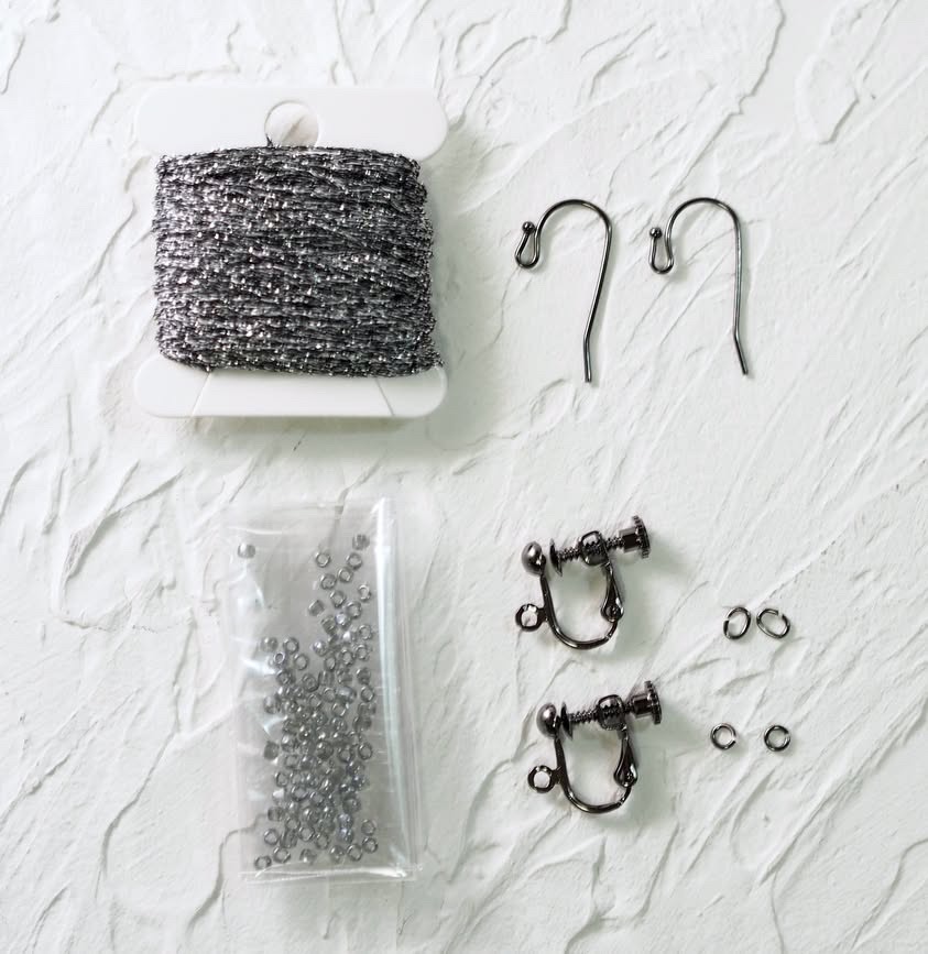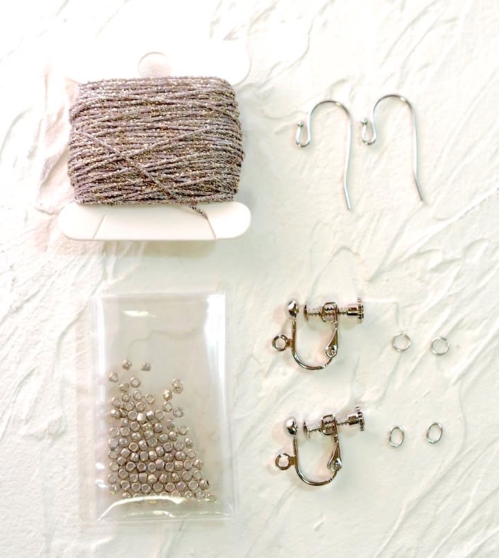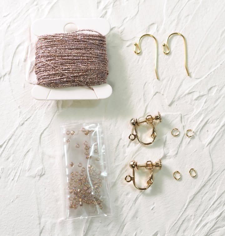 ●レシピ 5枚(ビーズの入れ方、金具の取り付け方ページ有)●ダルマラメのレース糸、ビーズ、ピアス金具、イヤリング金具(丸カン、Cカン付き)