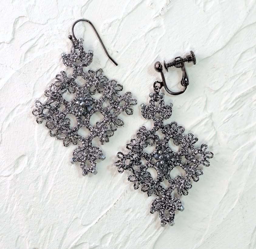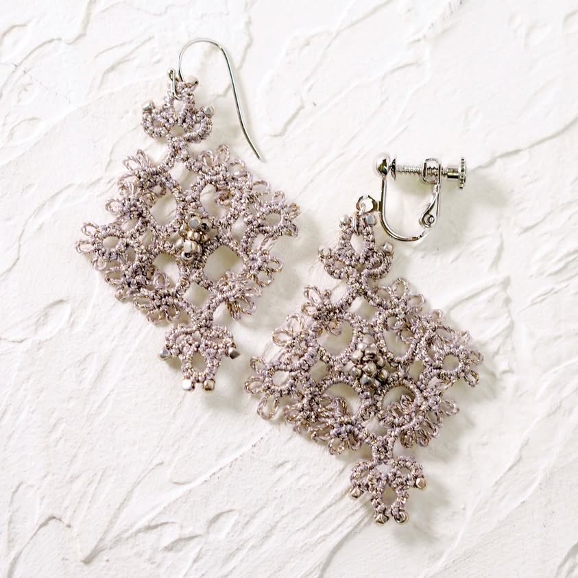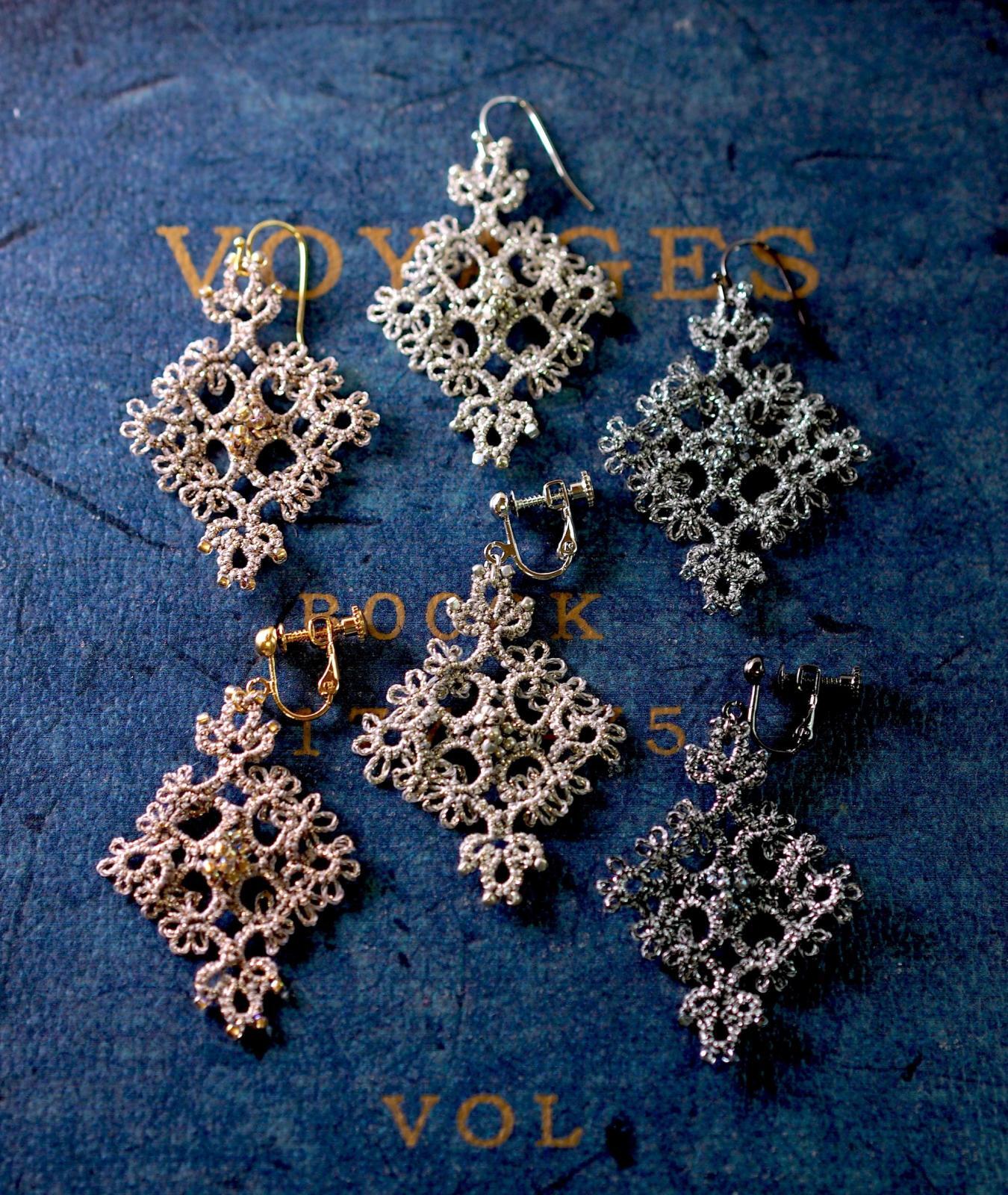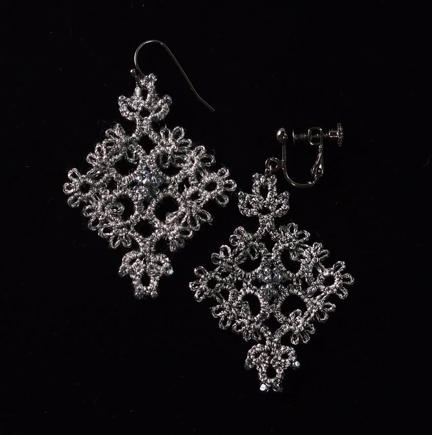【古書アレンジ】紋章風ピアスPRICILLA Tatting Book No.2 1915 年 Fig.4 Insertion よりアレンジ内容 絹穴糸 10m程度 丸小ビーズ140個 丸カン・ピアス…