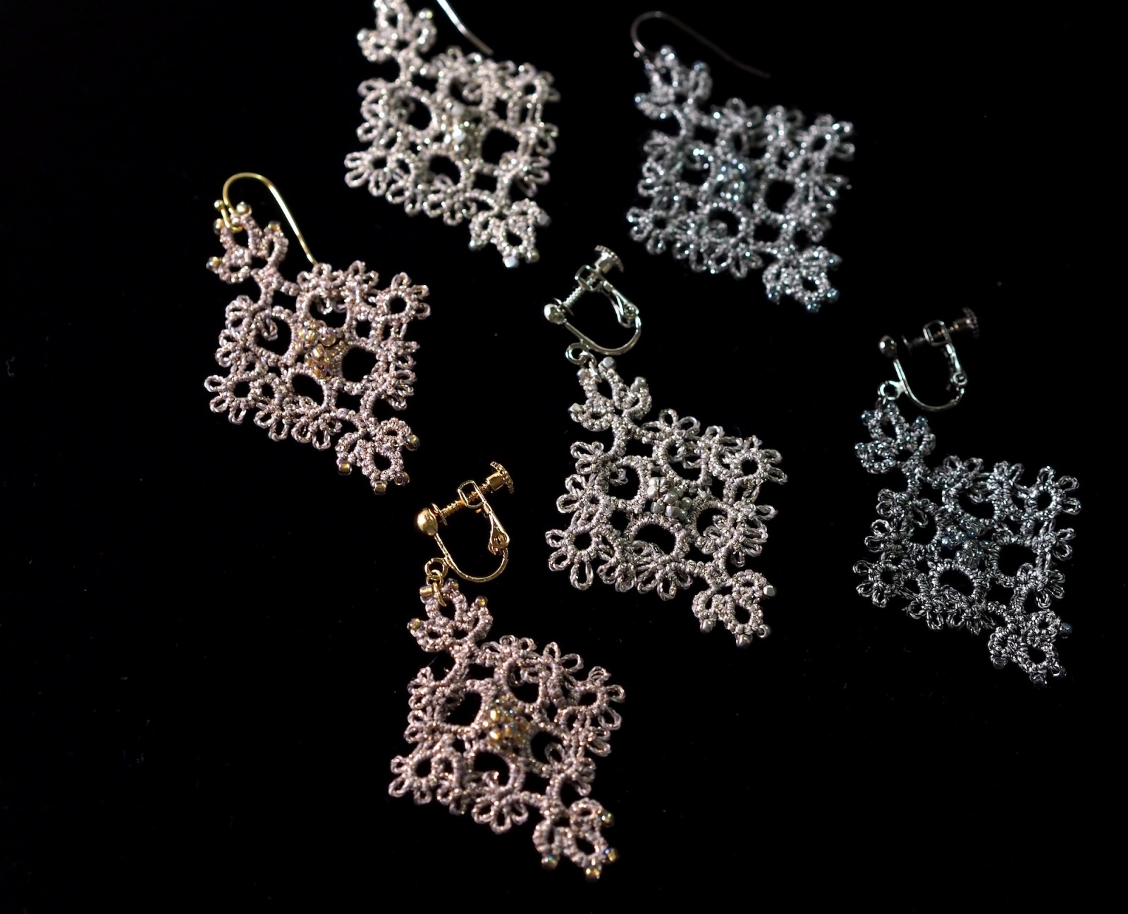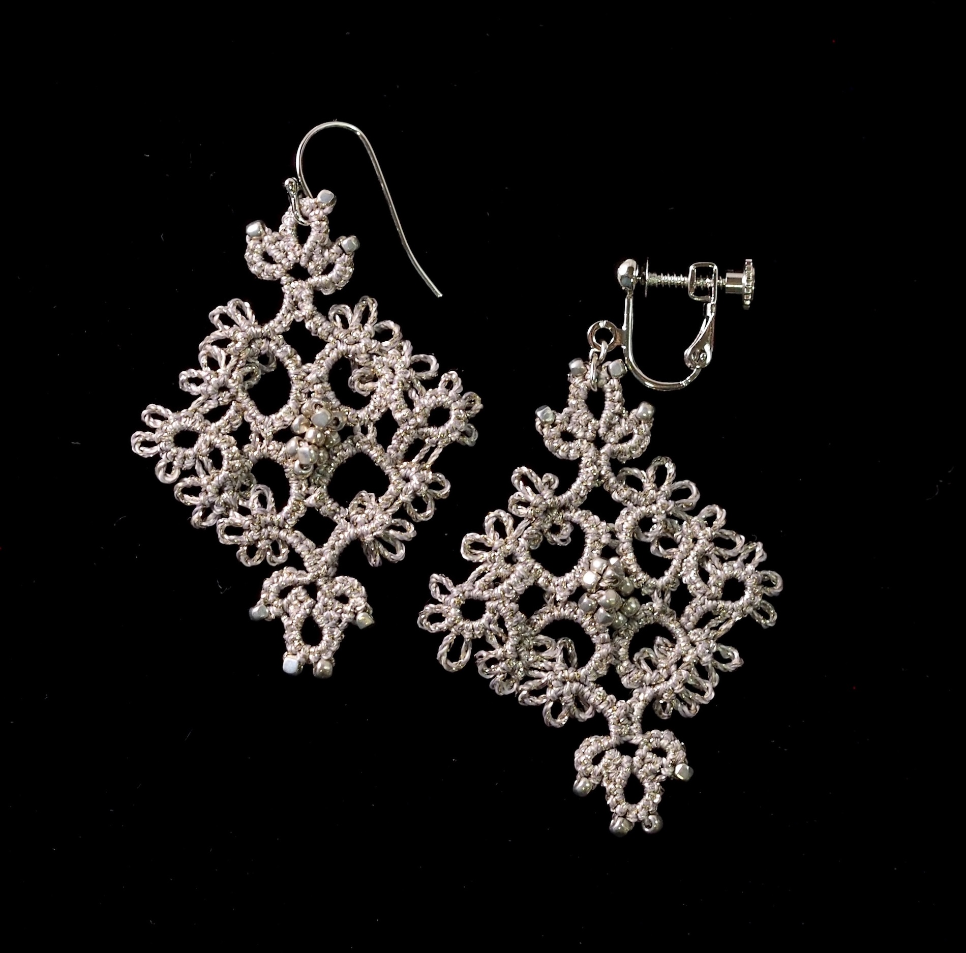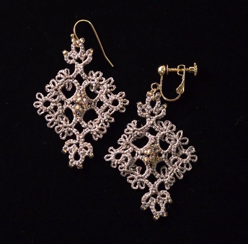 【古書アレンジ】紋章風ピアスPRICILLA Tatting Book No.2 1915 年 Fig.4 Insertion よりアレンジ内容 絹穴糸 10m程度 丸小ビーズ140個 丸カン・ピアス…