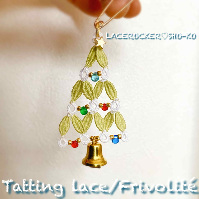 【ご予約商品】クリスマスリースのプチブローチかわいいリボンのブローチピンに、ちっちゃなクリスマスリースをぶら下げました。タティング部分は基本テクニックだけで大丈夫。お洋服やバッグにつけたり、お友達への…