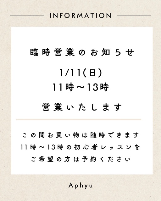 Aphyu自由が丘店は日曜定休ですが、1/11(日)は11時〜13時臨時営業いたします。