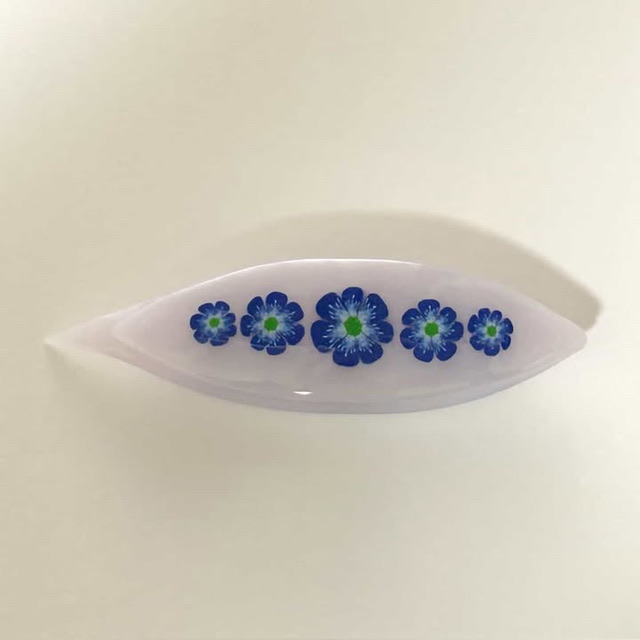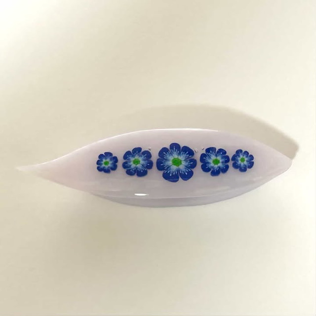 ドイツ製ポリマークレイを使った猫の目工房特製ミルフィオリ(金太郎飴細工のような棒状の模様)を透明樹脂で何層にもコーティングしました。